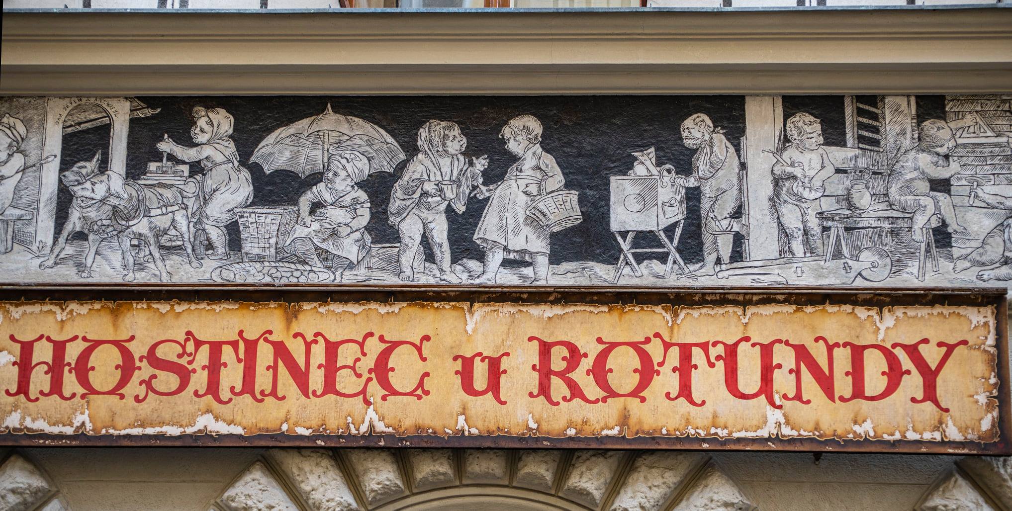 Если картинки на фасаде дома рассказывают нам о повседневности 1870-х годов, то с повседневностью 1970-х связано название заведения Hostinec u Rotundy. Именно здесь, собственно, заявленный в заголовке клуб, и располагался. По вечерам в пивной под яркой вывеской собирались пражские «манички». Так называли, да и теперь ещё называют, представителей субкультуры, родственной хиппи, носящих длинные волосы. Подробнее желающим я расскажу о них на своей экскурсии, посвященной тоталитарной Праге. Здесь же отмечу, что манички делились на разные подгруппы. И вот именно в нашем заведении у ротонды собирались те их представители, которых называли «мазачи». (Нет, не по ассоциации с Мазаччо — великим художником итальянского Возрождения, конечно. Хотя и жаль).