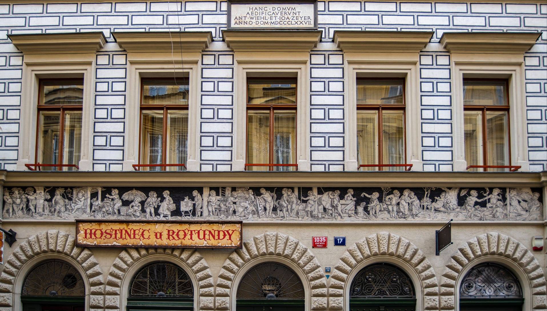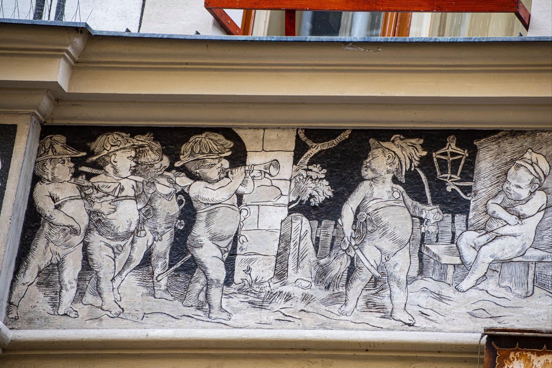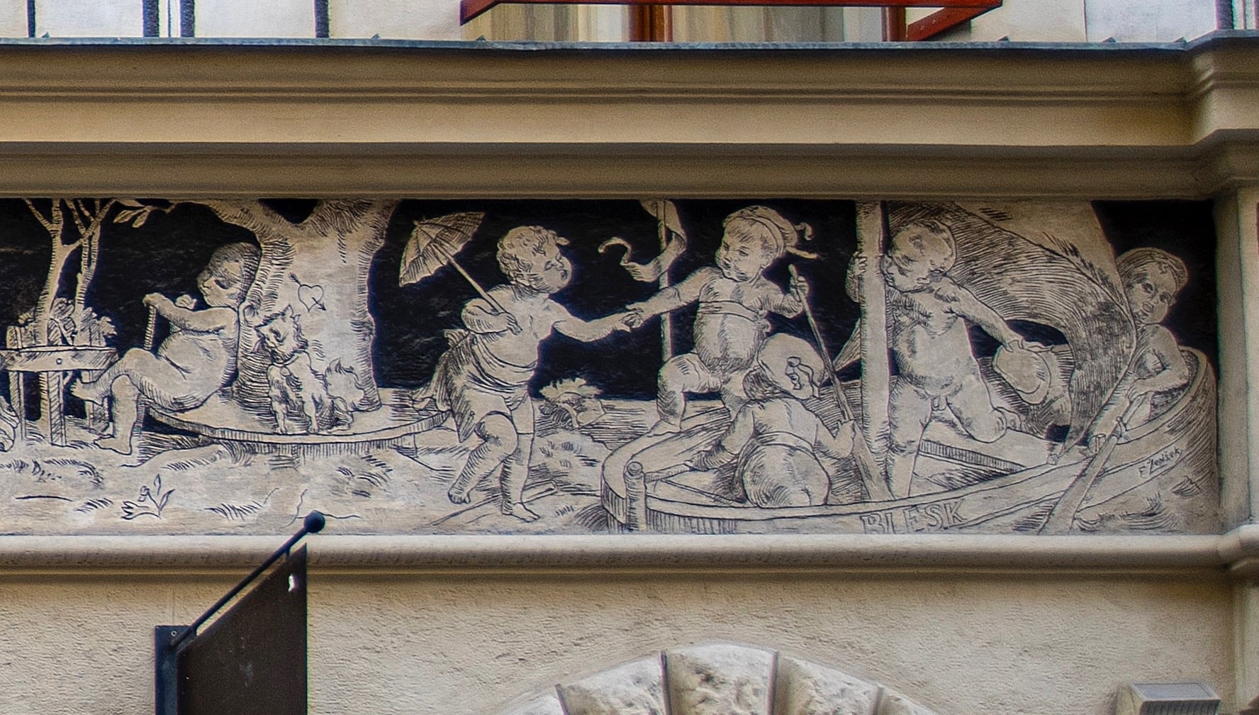 Сграффито на фасаде дома, выполненное по эскизам крупного чешского художника Франтишека Женишека, уникально тем, что это первый пример оформления пражских домов не легендарными и историческими мотивами, но сценками из жизни современного города. А чтобы было веселее пражане изображены здесь в виде так характерных для Ренессанса младенцев-путти. (Сейчас внезапно подумал об этимологии восклицания «ути-пути!», но это, впрочем, к делу не относится).