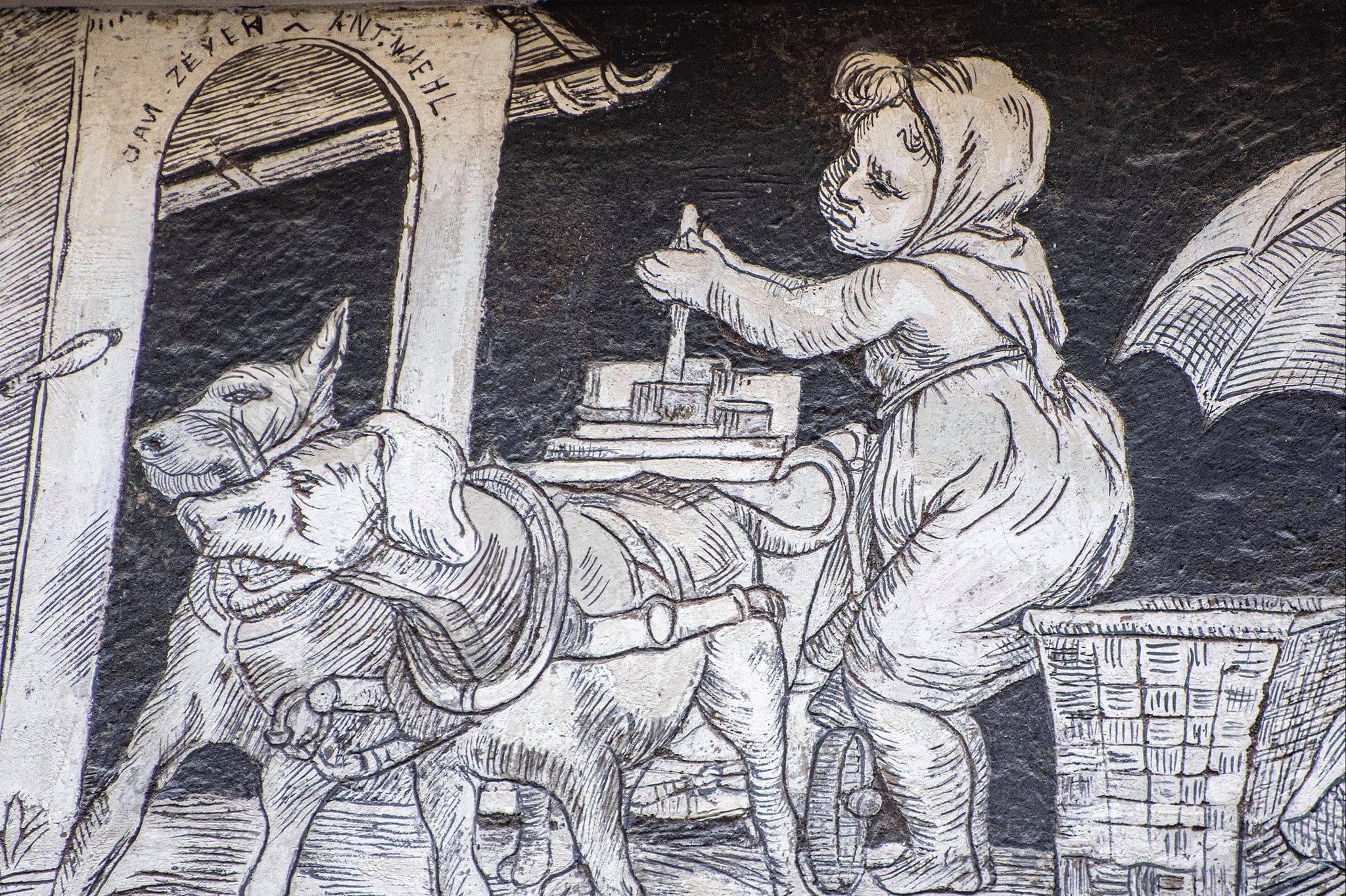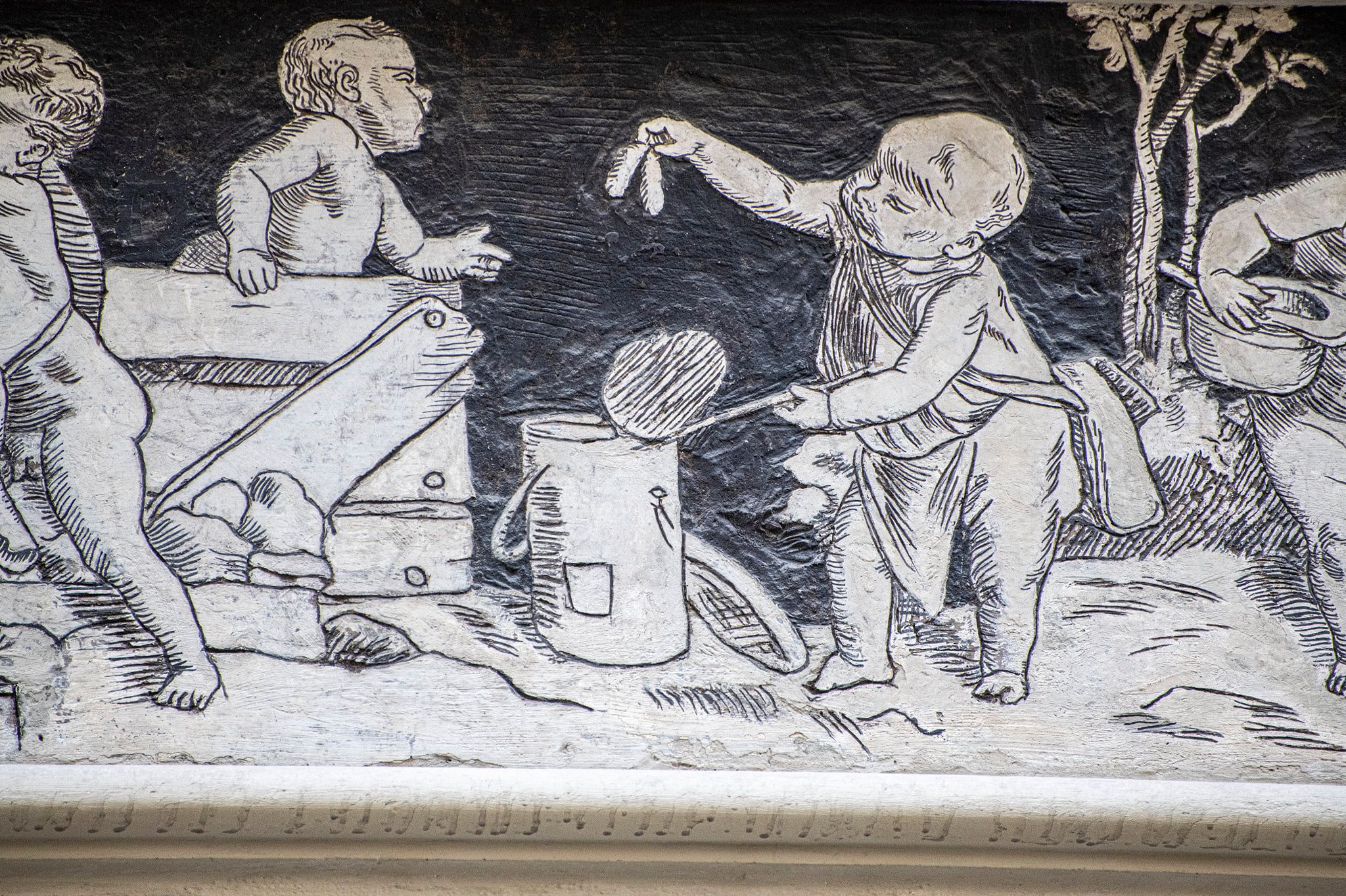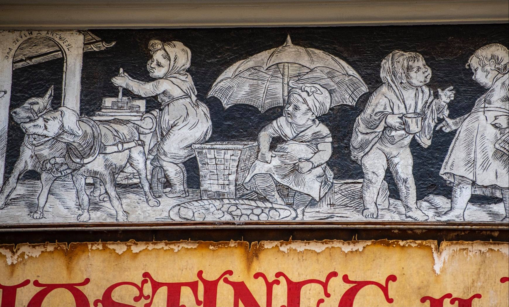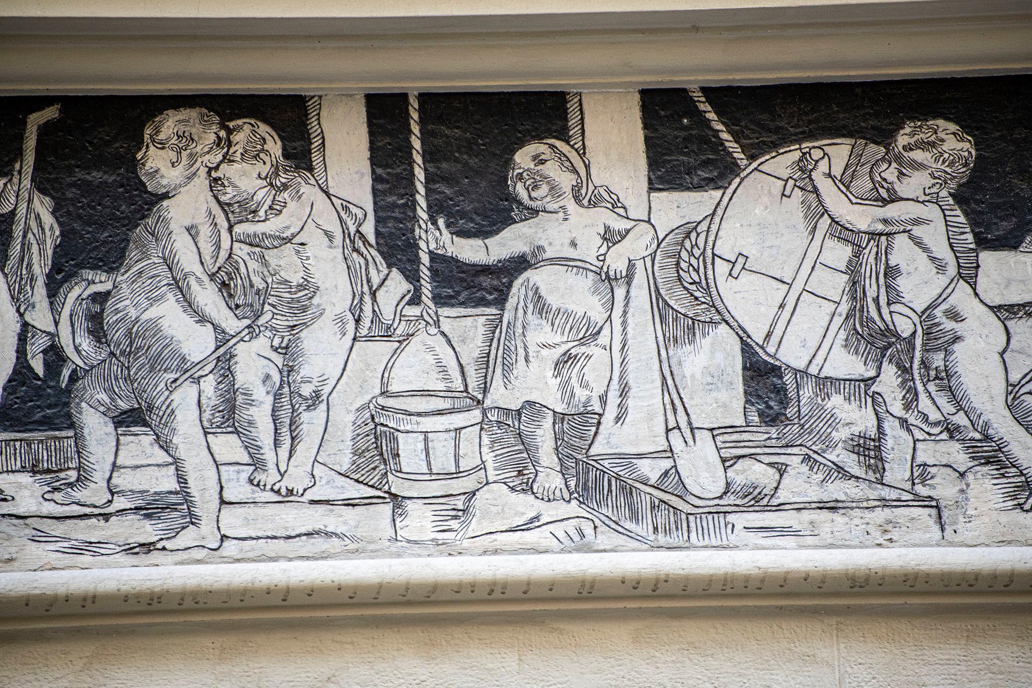Сграффито на фасаде дома, выполненное по эскизам крупного чешского художника Франтишека Женишека, уникально тем, что это первый пример оформления пражских домов не легендарными и историческими мотивами, но сценками из жизни современного города. А чтобы было веселее пражане изображены здесь в виде так характерных для Ренессанса младенцев-путти. (Сейчас внезапно подумал об этимологии восклицания «ути-пути!», но это, впрочем, к делу не относится).