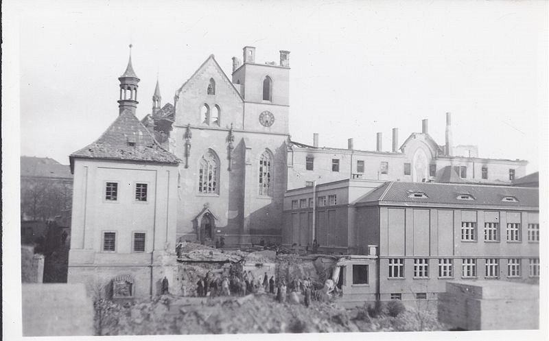 Всего за три минуты 62 бомбардировщика B-17 Flying Fortress сбросили на центральную часть города 58 тонн бомб. В руины превратились 183 здания и около 200 были серьезно повреждены. Некоторые из строений представляли культурно-историческую ценность, например, Эммаусский монастырь, дом Фауста, Виноградская синагога.