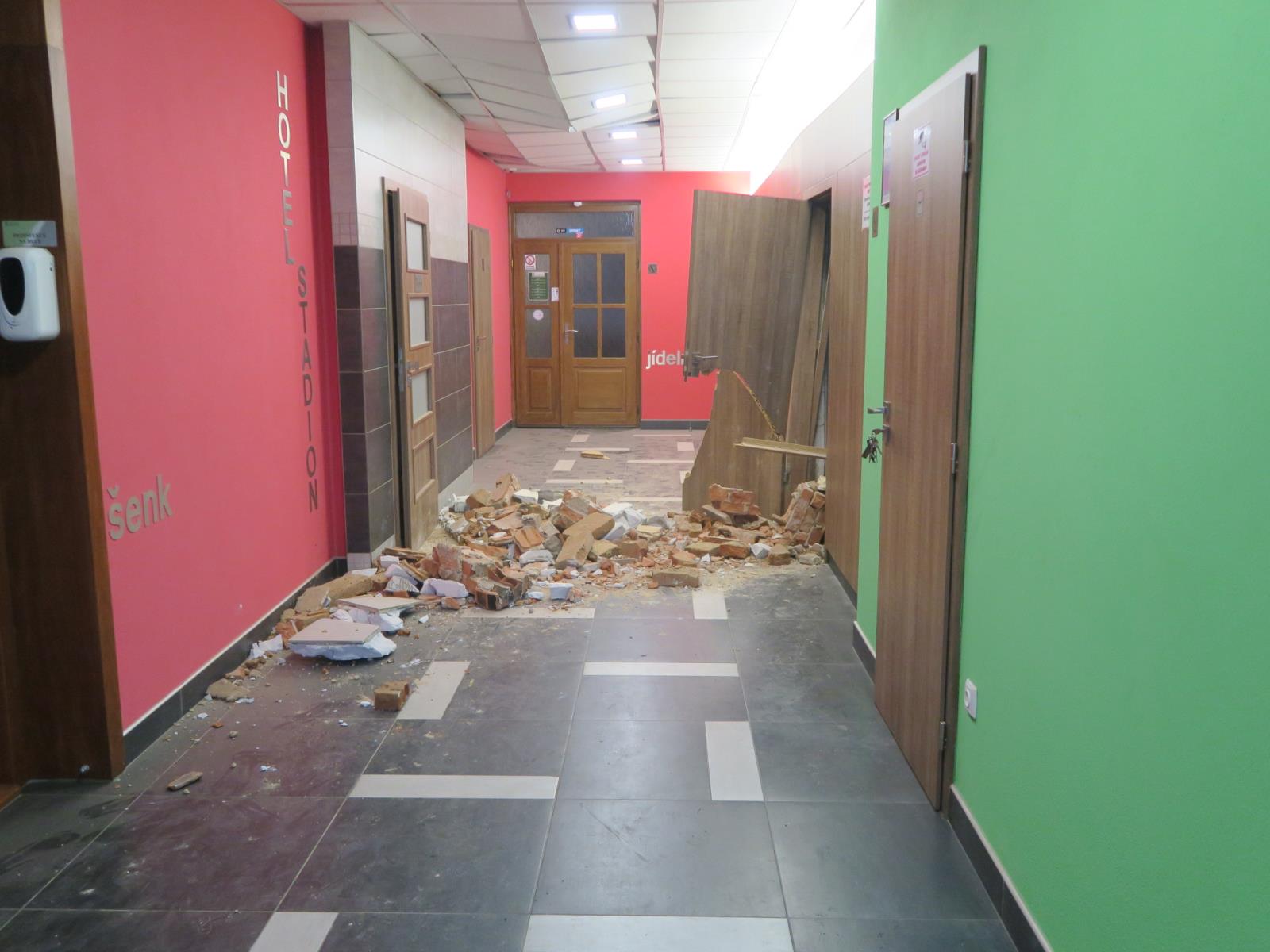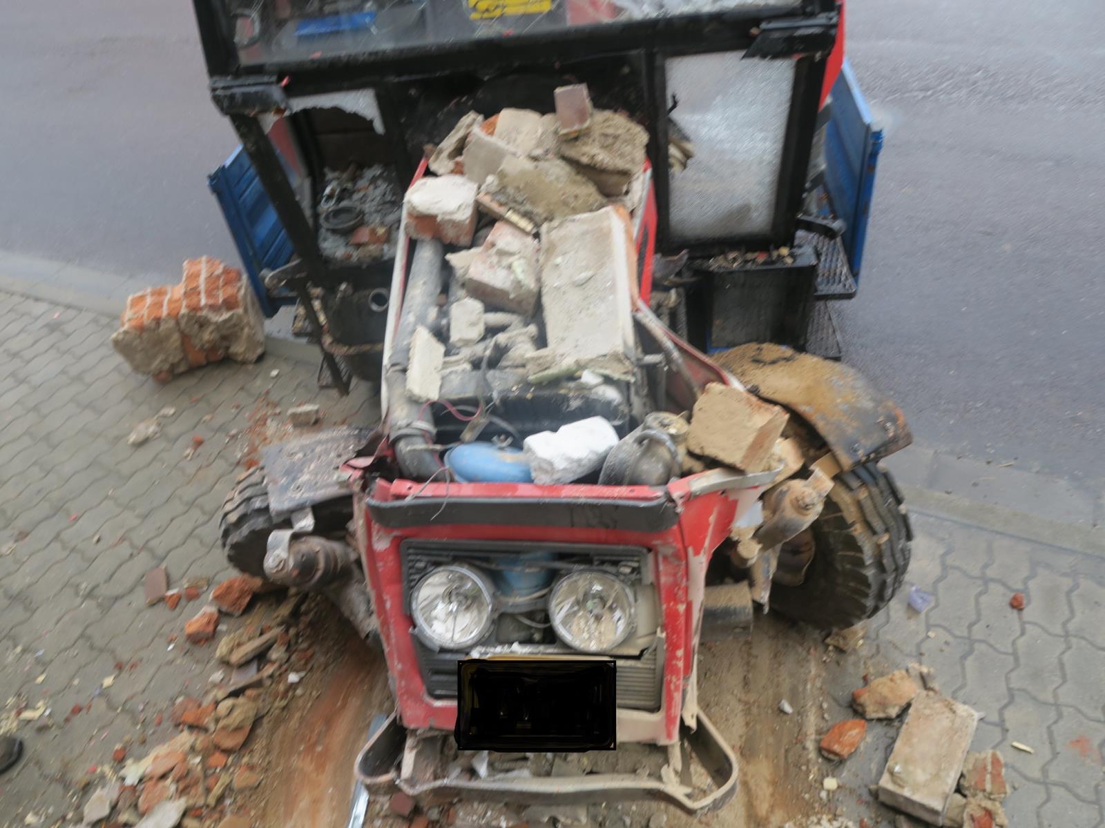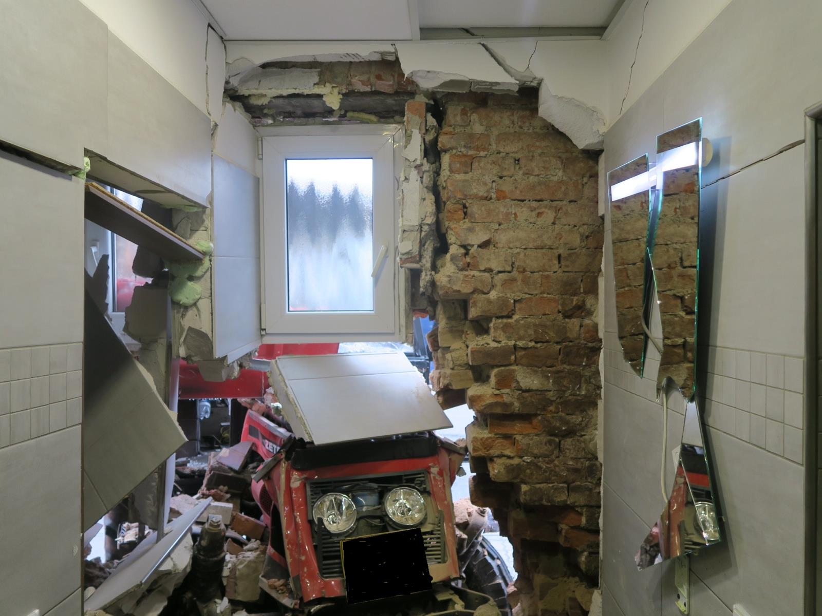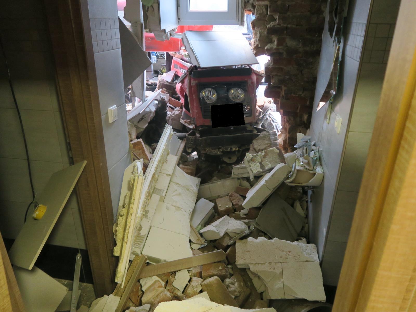 Инцидент произошел утром в минувшую субботу. Трактор марки Zetor пробил кирпичную стену и оказался прямо в туалете гостиницы.