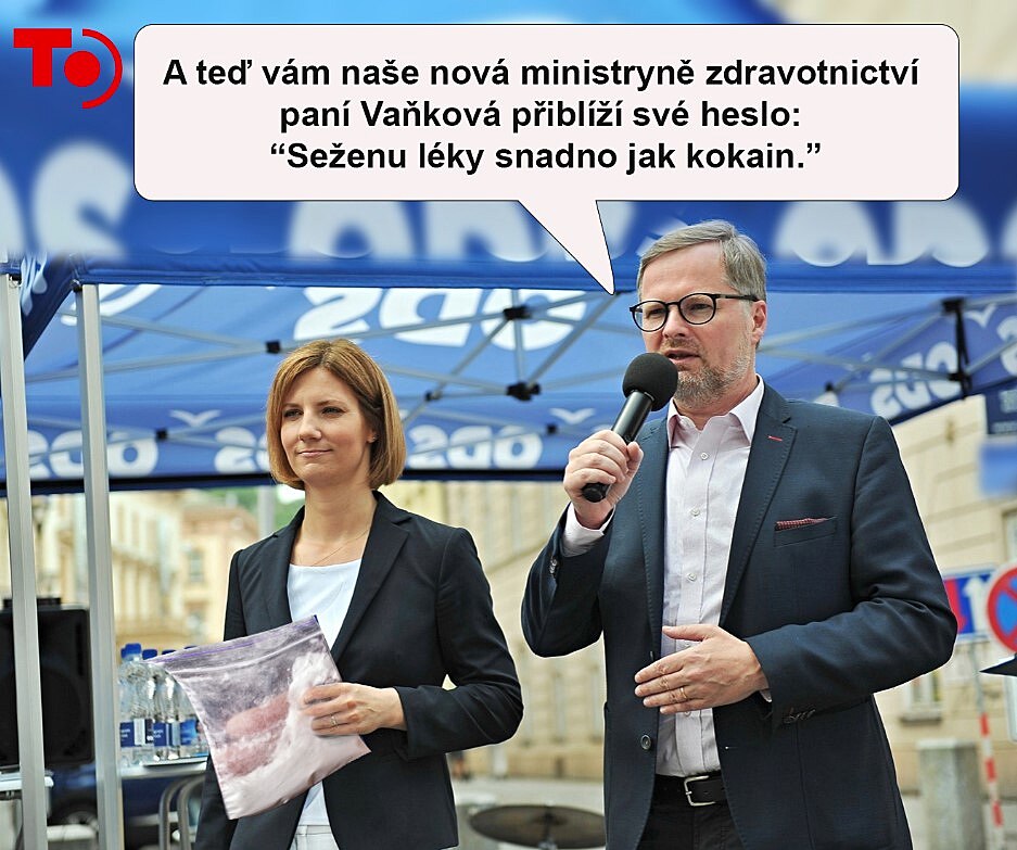 «А теперь наш новый министр здравоохранения Маркета Ванькова наглядно продемонстрирует вам свой девиз: «Достану лекарства легко, как кокаин»».
