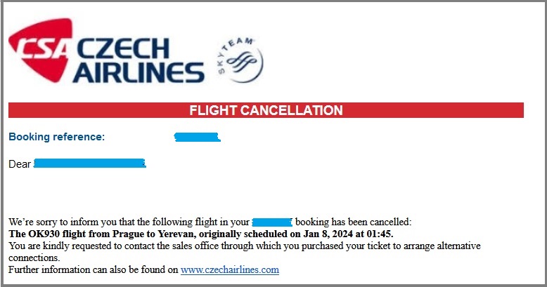 Авиакомпания Czech Airlines приняла решение отказаться от запуска прямой авиалинии Прага-Ереван. Причина – низкий спрос. В пятницу, 3 ноября, перевозчик разослал пассажирам уведомление об отмене всех ранее купленных билетов.
