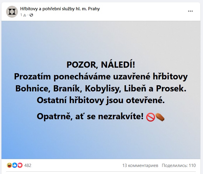 Из-за сильного гололеда, а затем гололедицы, компания закрыла для посетителей вход на пять кладбищ (Bohnice, Braník, Kobylisy, Libeň, Prosek).