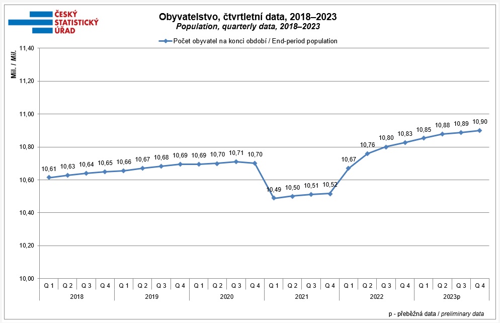 За весь 2023 год численность населения Чехии увеличилась на 73026 человек до 10,9 млн жителей. Прирост обеспечила исключительно миграция, поскольку число умерших превысило число новорожденных. Такие данные во вторник, 20 марта, обнародовало Чешское статистическое управление (ČSÚ).