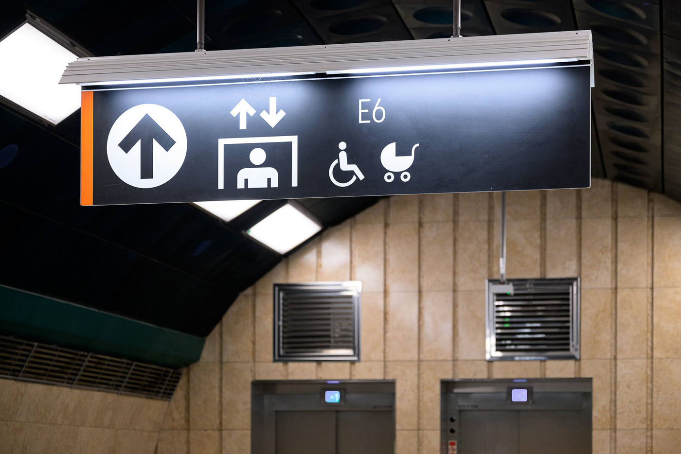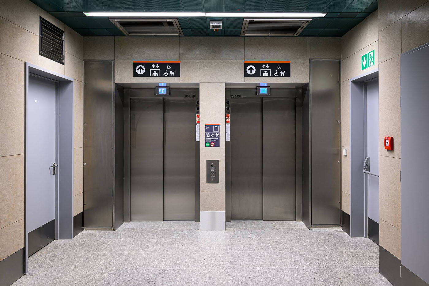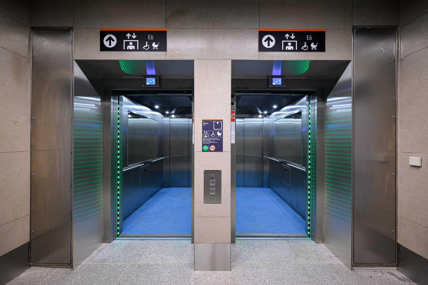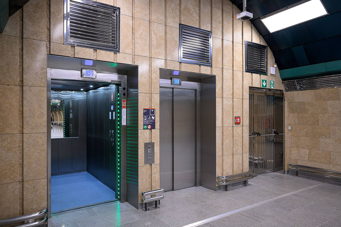Лифты располагаются в разных частях станции – протяженность перехода между ними составляет 40 метров. Каждая кабина рассчитана на 21 пассажира или 1600 кг.