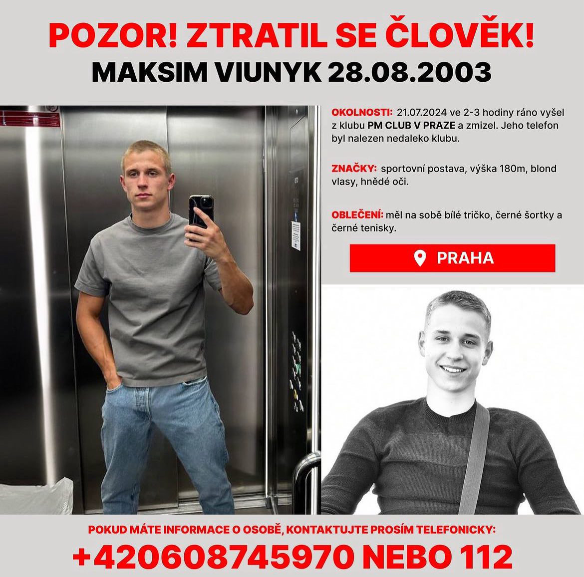 Полиция Праги продолжает поиски 20-летнего гражданина Украины Максима Вюника (Maksym Viunyk). Последний раз его видели в ночь на воскресенье, 21 июля, выходящим из музыкального клуба P.M. Club в центре города (Trojická 10, Nové Město, Praha 2).