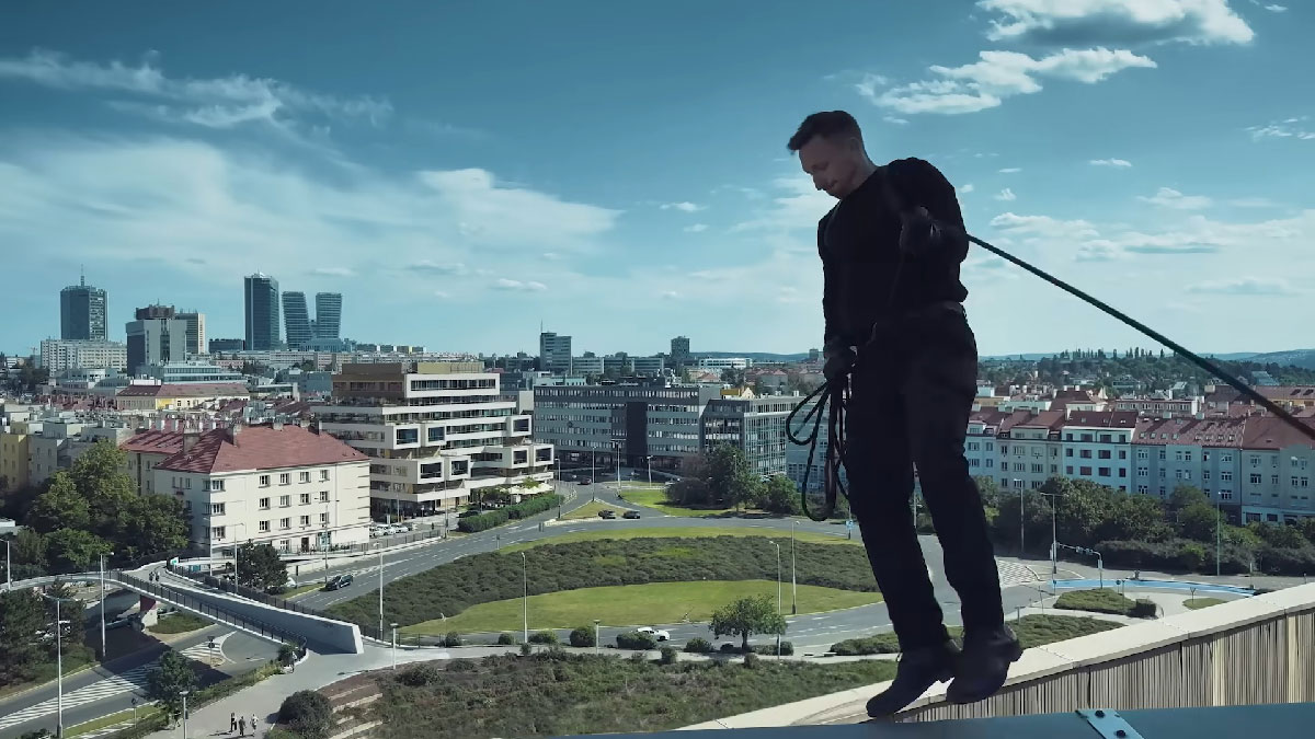 Далее зрителя возвращают в Прагу, показывая чудеса монтажа и компьютерной графики – каскадер прыгает с крыши Конгресс-центра в районе Вышеград: