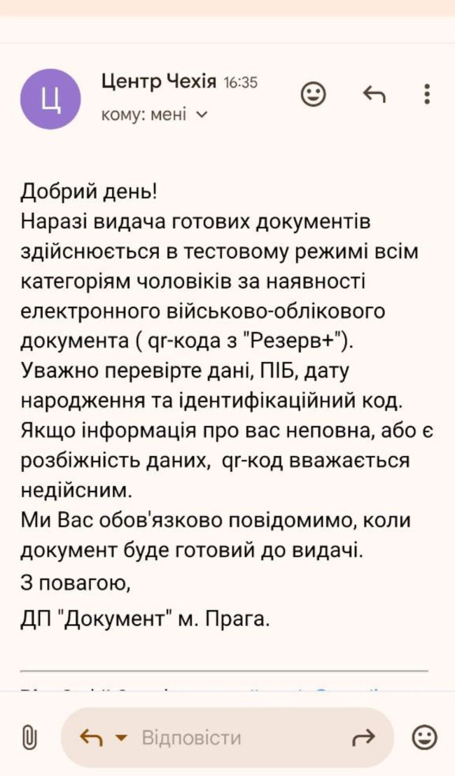 «Сейчас выдача готовых документов осуществляется в тестовом режиме всем категориям мужчин при наличии электронного военно-учетного документа (QR-кода "Резерв+")», - говорится в письмах, которые пражский филиал ГП «Документ» начал рассылать заявителям.