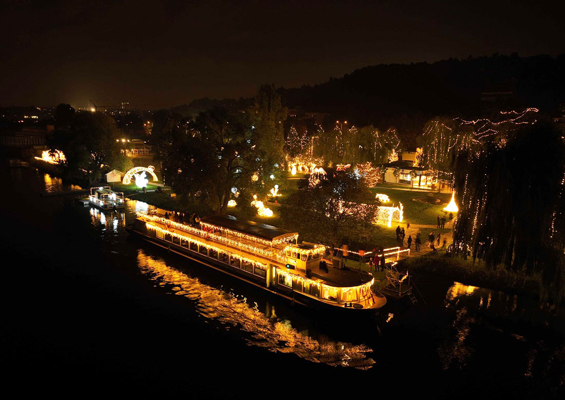 За дополнительную плату посетители могут прокатиться на корабле и осмотреть светящийся парк с реки.