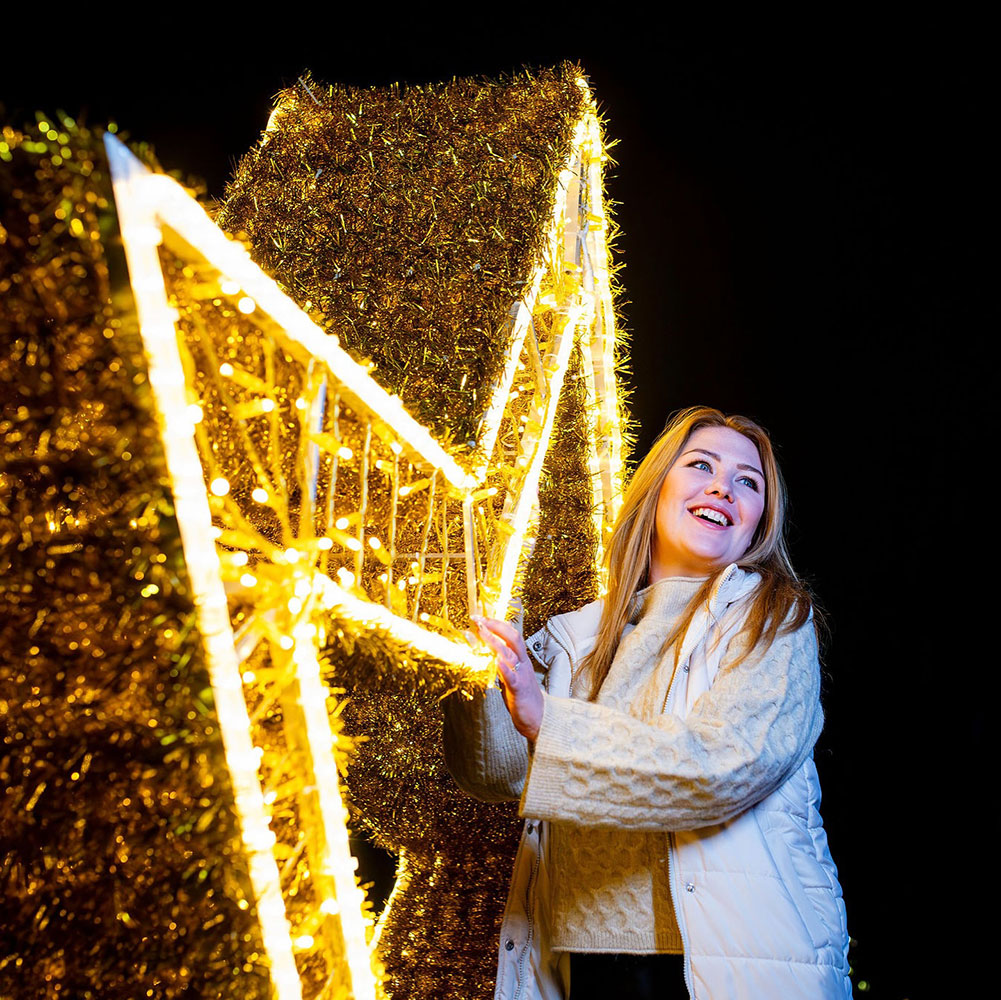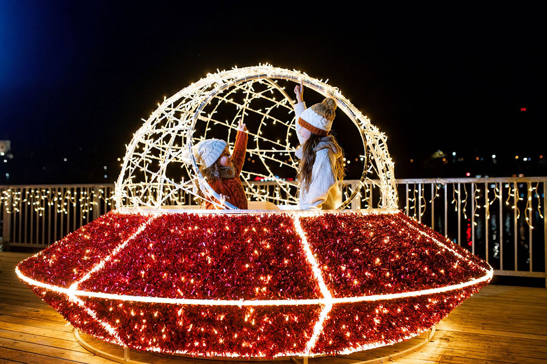 Гости увидят абсолютно новые светящиеся скульптуры, не выставлявшиеся в прошлые годы – огромные пятиметровые планеты (Земля, Юпитер, Сатурн и другие), ракету со встроенной детской горкой, космическую станцию, космонавтов, инопланетян ,летающую тарелку, спутники, кометы, космическую станцию и другие объекты.