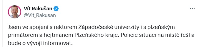 Министр внутренних дел Чехии Вит Ракушан написал в соцсети X, что находится в контакте с руководством полиции и главой Пльзеньского края.