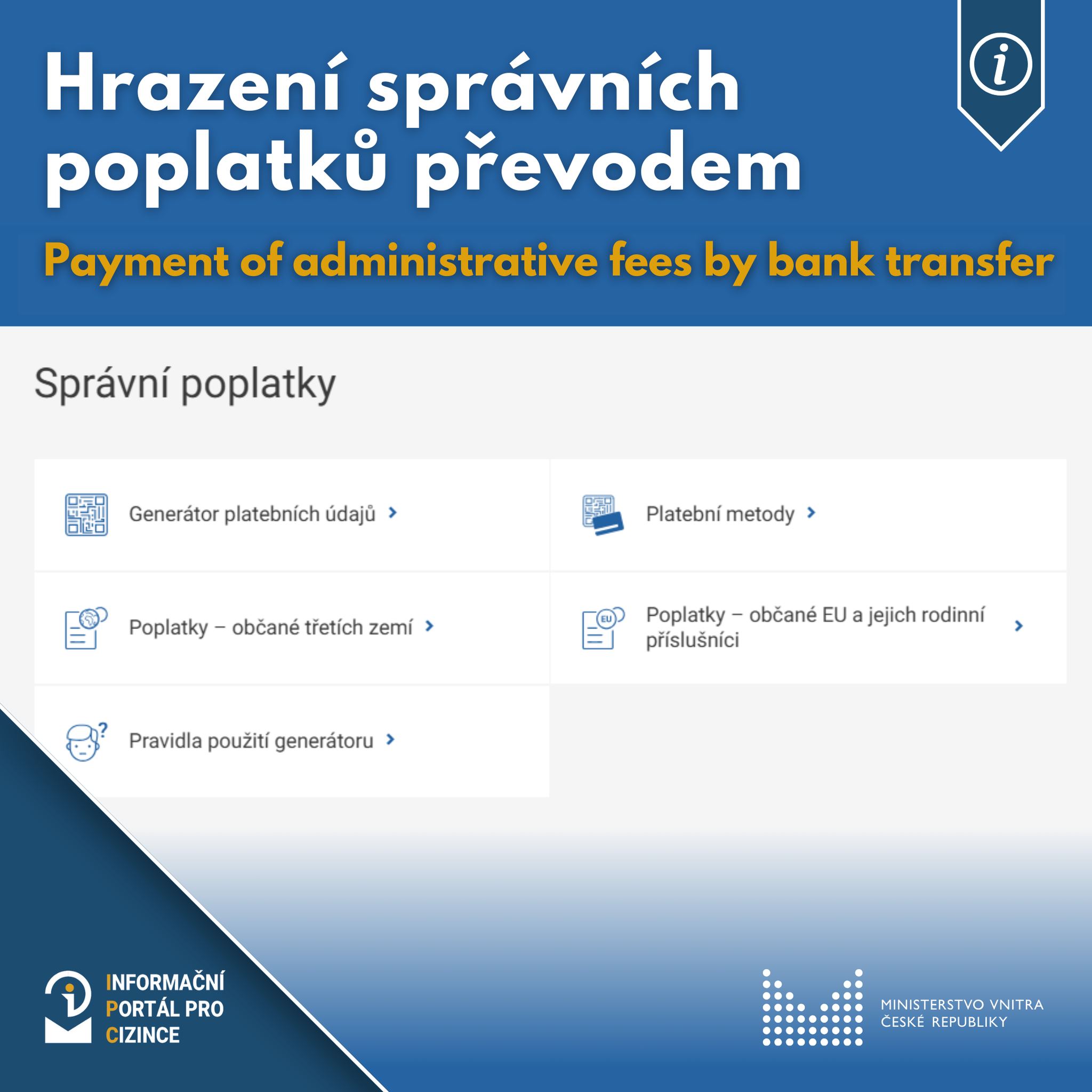 2) Для заявлений, отправляемых по почте или через «датову схранку», административный сбор оплачивается заранее банковским переводом с использованием онлайн-генератора платежных данных (generátor platebních údajů).