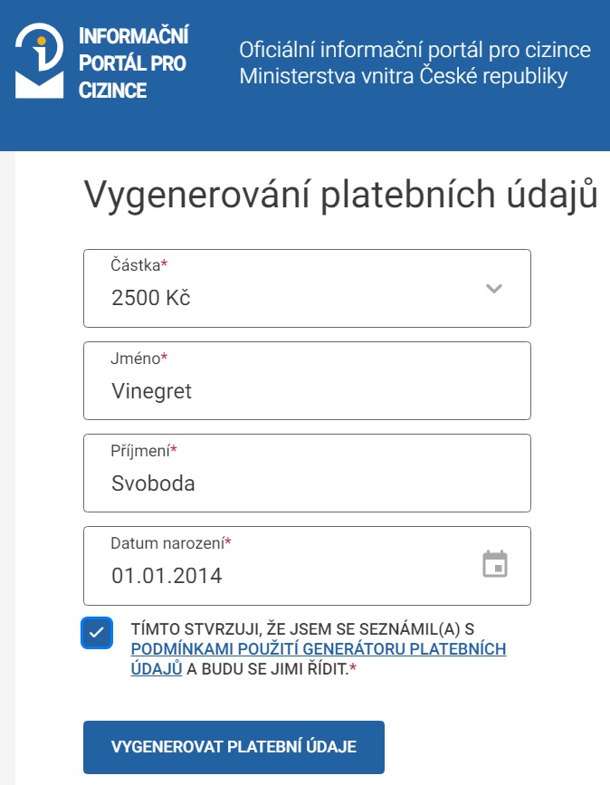 - перед подачей заявления сгенерируйте через портал платежные данные – номер банковского счета МВД и ваш идентификационный код (variabilní symbol);