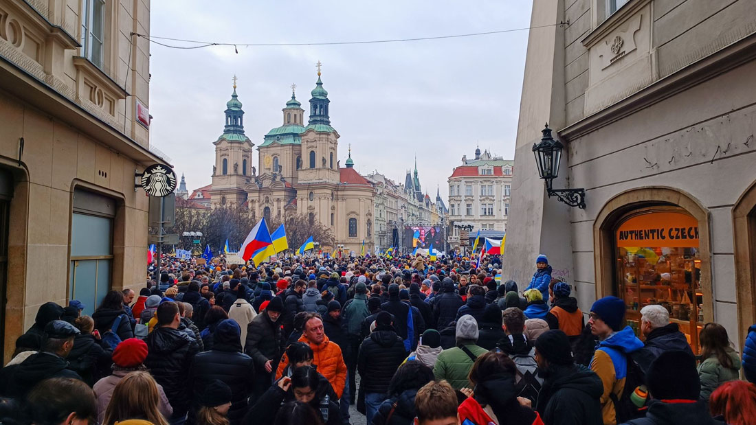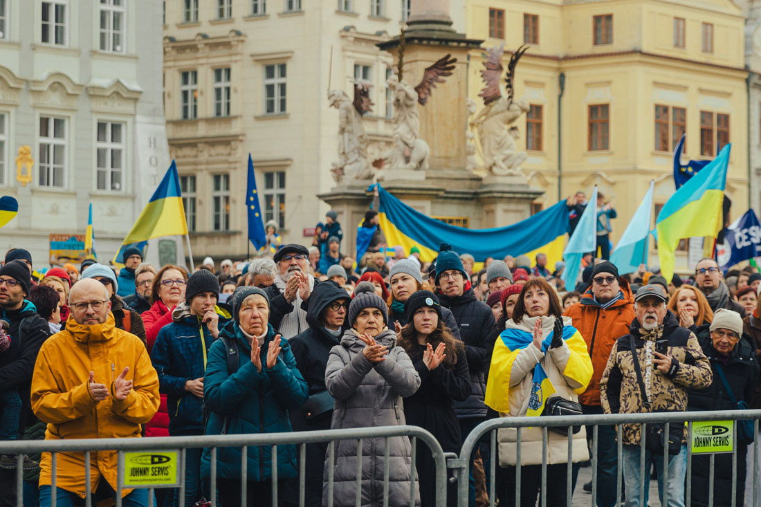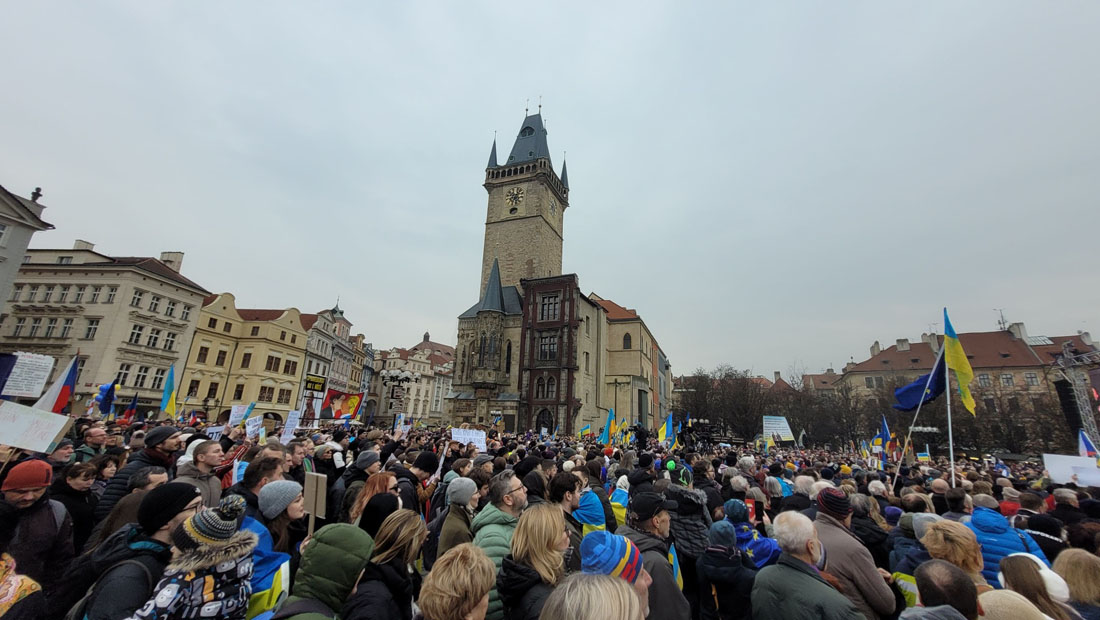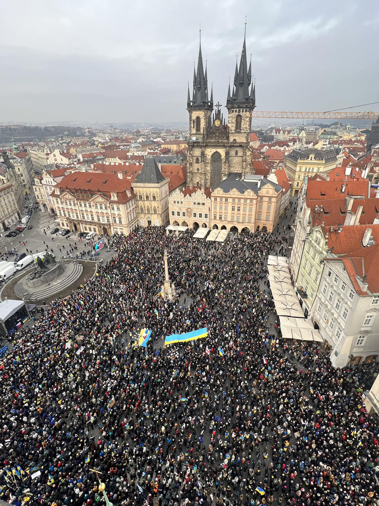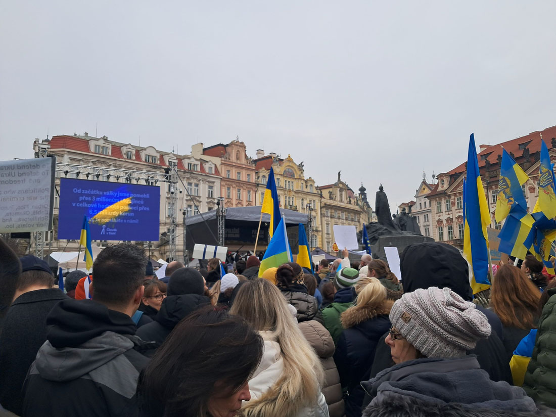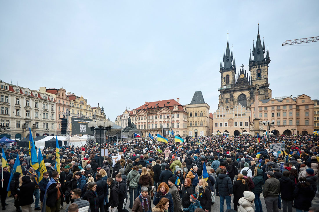Днем в воскресенье, 23 февраля, накануне третьей годовщины полномасштабного российского вторжения в Украину на Староместской площади Праги состоялся масштабный митинг в поддержку украинского народа. Он собрал тысячи человек, которые заняли почти все свободное пространство на площади.