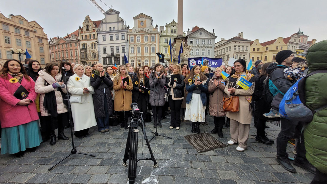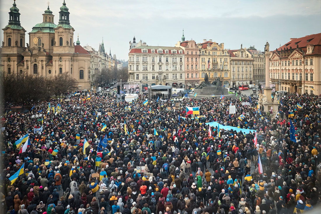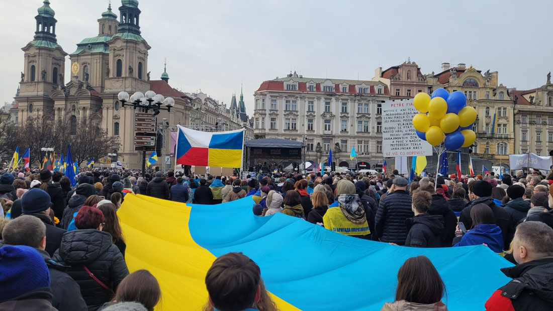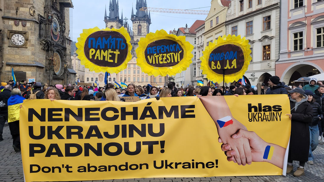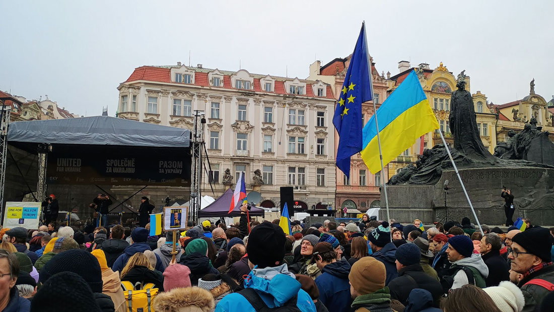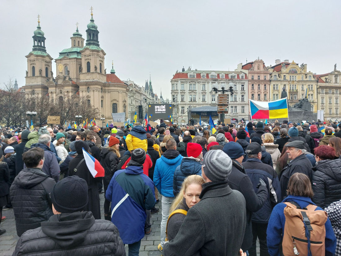 Днем в воскресенье, 23 февраля, накануне третьей годовщины полномасштабного российского вторжения в Украину на Староместской площади Праги состоялся масштабный митинг в поддержку украинского народа. Он собрал тысячи человек, которые заняли почти все свободное пространство на площади.