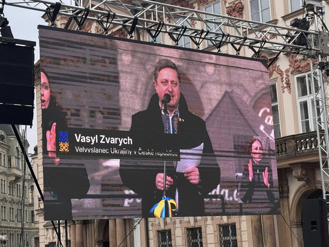 Речь также произнес посол Украины в Чехии Василий Зварыч, заявивший, что его страна будет продолжать бороться за свободу и не уступит России ни пяди своей земли.