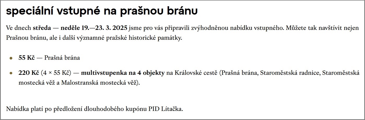 Кроме того, с 19 по 23 марта все обладатели любого долговременного проездного на общественный транспорт PID Lítačka смогут посетить Пороховую башню за символические 55 крон.