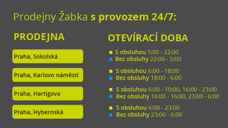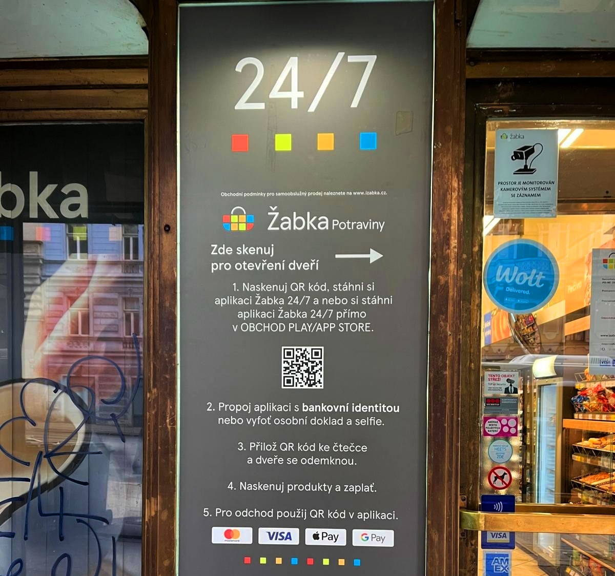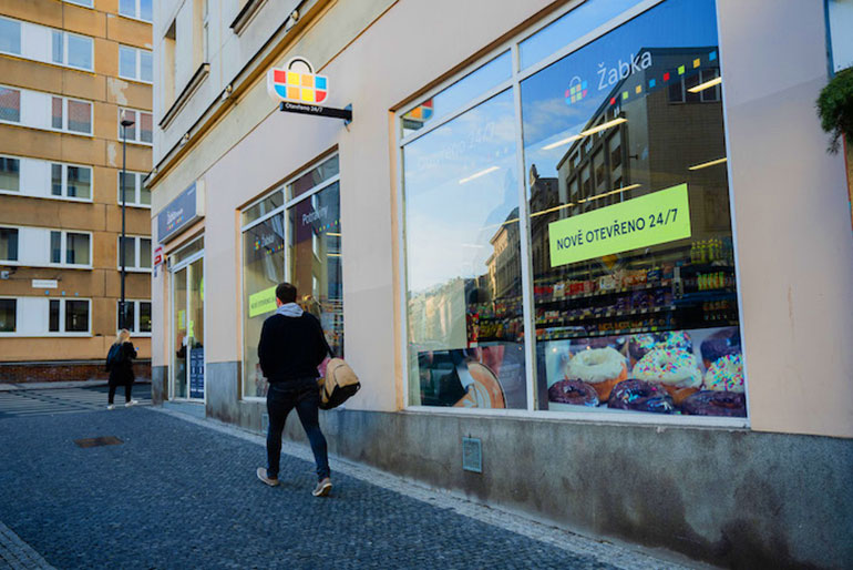 Розничная сеть продуктовых магазинов и товаров для дома Žabka открыла в центре Праги четыре круглосуточных магазина самообслуживания. Тем самым компания стремится удовлетворить спрос на гибкие возможности покупок.