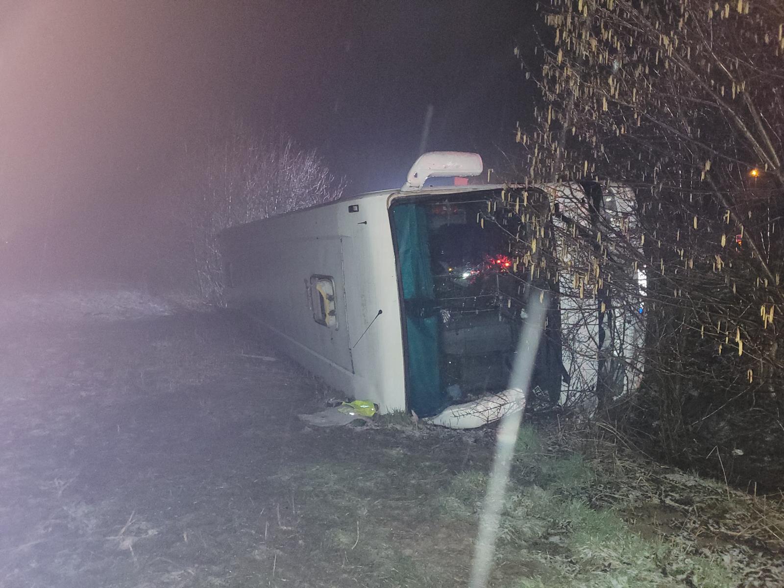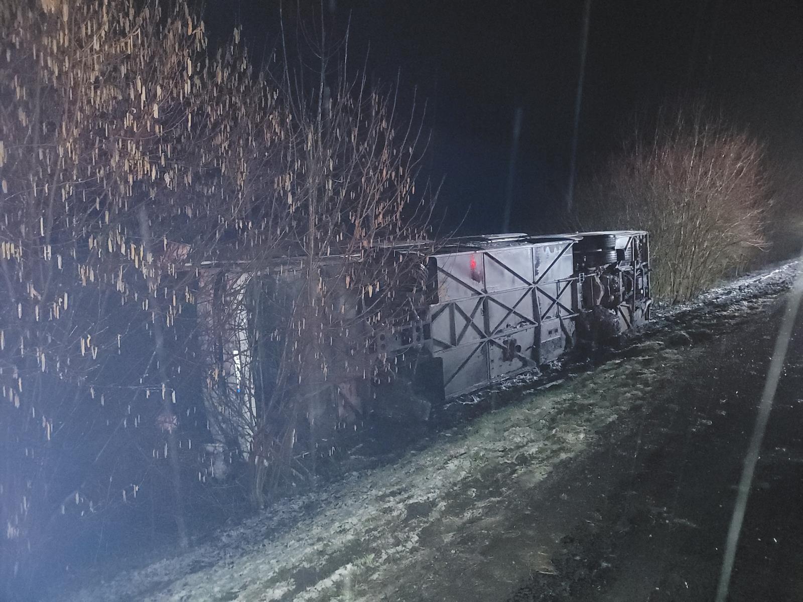 Вечером в пятницу, 14 марта, на шоссе в чешском поселке Жерманице (Žermanice, Моравскосилезский край) водитель автобуса по неизвестной пока причине съехал в кювет, в результате чего многотонная машина опрокинулась на правый бок.
