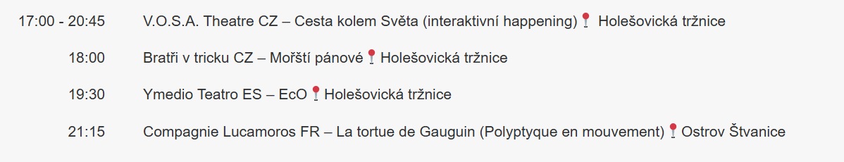 📍 Главной площадкой фестиваля станет Голешовицкий рынок (Holešovická tržnice), но несколько представлений состоятся в самом центре города – на Марианской и Староместской площадях.