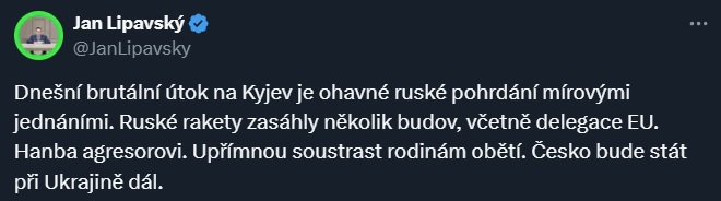 «Сегодняшнее жестокое нападение на Киев является отвратительным проявлением пренебрежения России к мирным переговорам. Российские ракеты поразили несколько зданий, включая представительство ЕС. Позор агрессору. Искренние соболезнования семьям жертв. Чехия будет и дальше поддерживать Украину», — написал министр иностранных дел республики Ян Липавский.