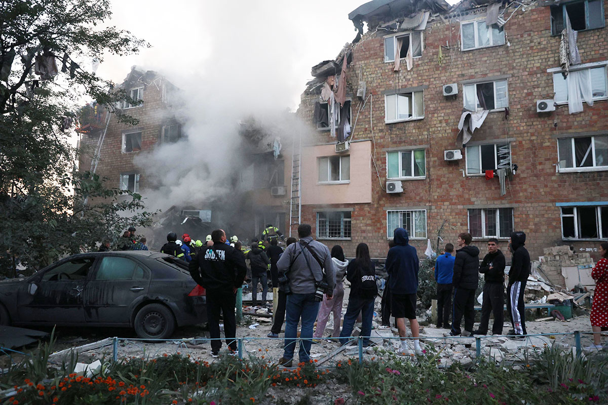 В Дарницком районе баллистическая ракета попала в жилую пятиэтажку. В результате обрушился целый подъезд. На месте работают спасатели.