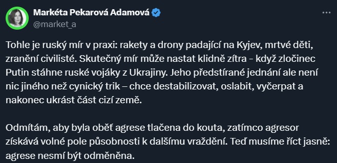 Я отказываюсь принимать, чтобы жертва агрессии была загнана в угол, в то время как агрессор получает полную свободу действий для дальнейших убийств. Сейчас мы должны сказать четко: агрессия не должна быть вознаграждена», — сказала председатель палаты депутатов чешского парламента Маркета Пекарова-Адамова.