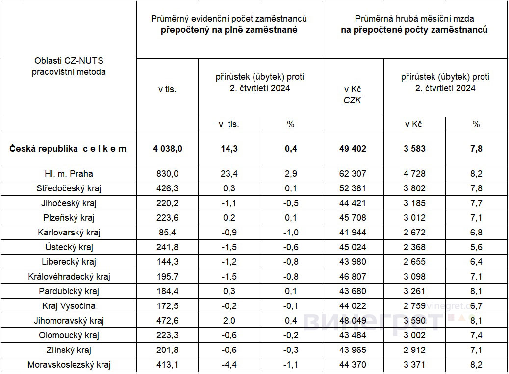 Численность трудоустроенных жителей и средняя зарплата в отдельных регионах Чехии во втором квартале 2025 года: