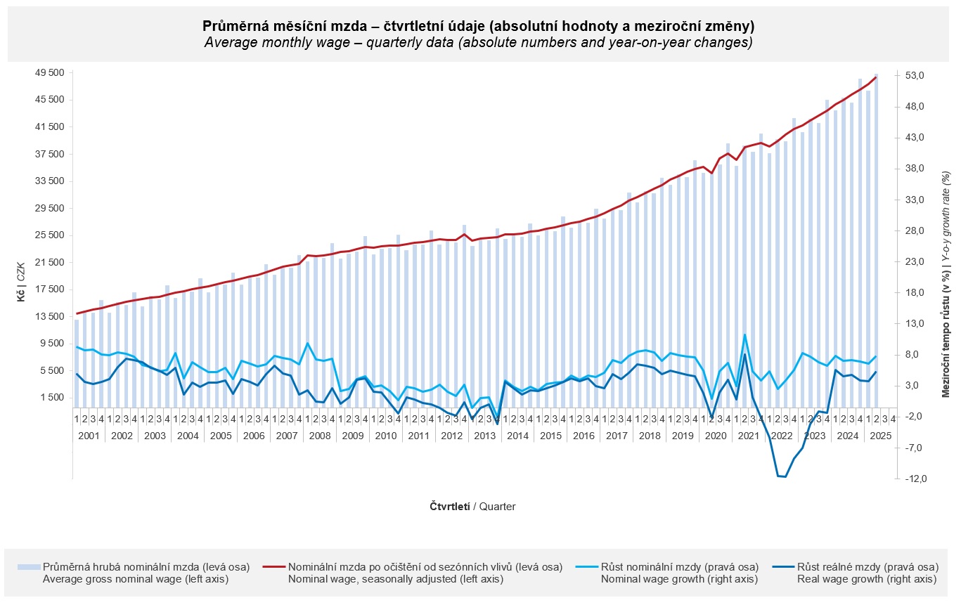 Во втором квартале 2025 года средняя ежемесячная зарплата в Чехии («грубая», до вычета налогов) выросла на 3583 кроны по сравнению с аналогичным периодом прошлого года и составила 49402 кроны. Такие данные в среду, 3 сентября, опубликовало Чешское статистическое управление (ČSÚ).