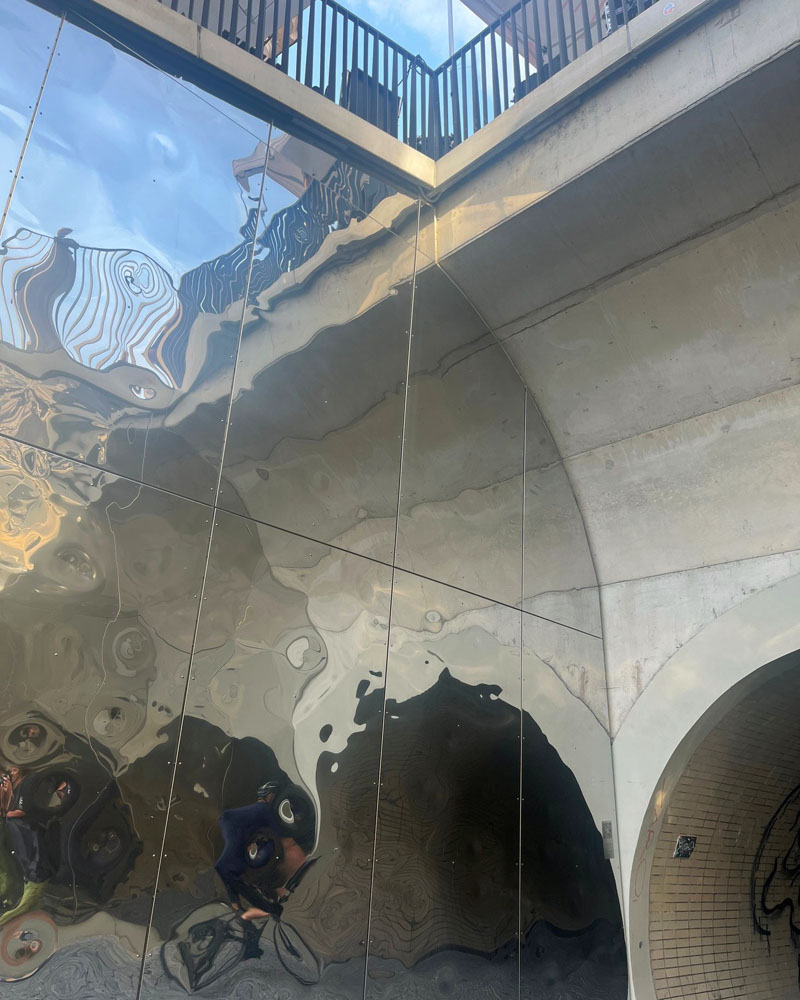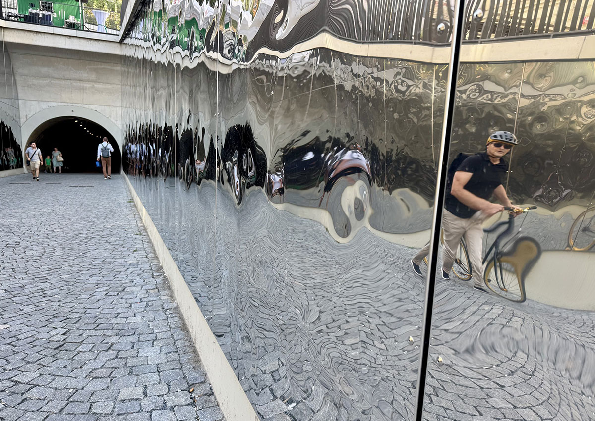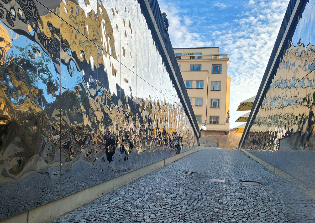 Вход в Жижковский тоннель в Праге украсили панелями кривого зеркала, а точнее отполированными до блеска стальными листами, которые создают интересную игру света и отражений.