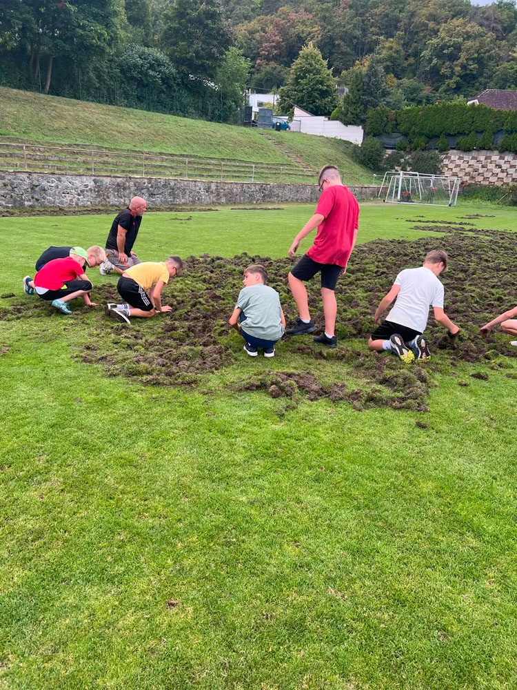 Сегодня днем семьи игроков с детьми пытались после увлажнения затоптать вырытые куски дёрна обратно в землю. Собралось примерно 60 самоотверженных добровольцев.