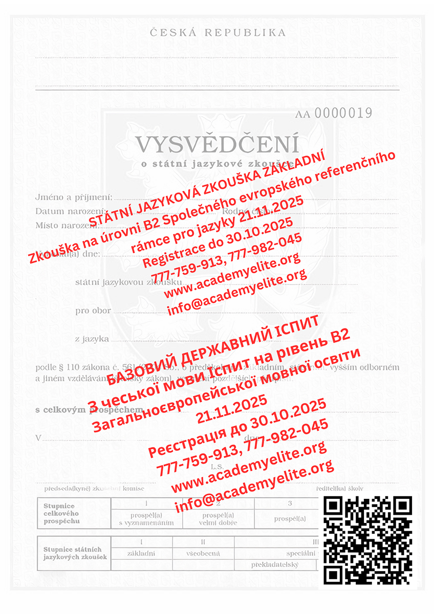 В пятницу, 21 ноября, в Праге можно будет сдать государственный экзамен по чешскому языку на уровень B2 и стать обладателем самого признаваемого сертификата в Чехии, который позволит без дополнительного языкового тестирования получить ПМЖ, чешское гражданство, поступить в университет или устроиться на престижную работу.