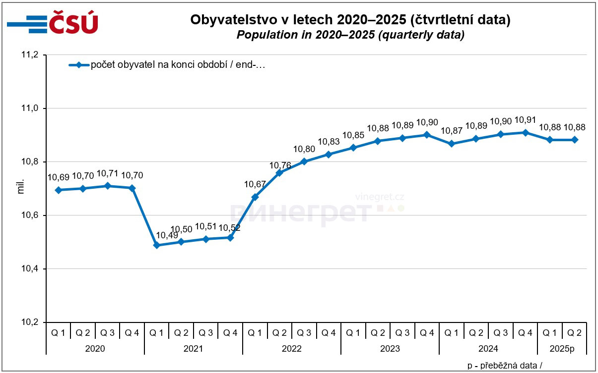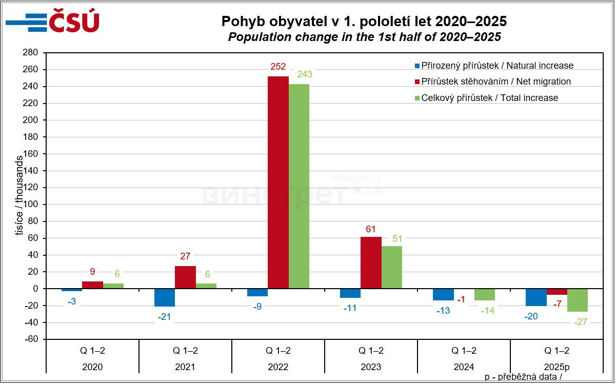 В первом полугодии 2025 года численность населения Чехии снизилась на 27159 человек до 10.882.341 жителя. Такие данные в четверг, 11 сентября, опубликовало Чешское статистическое ведомство (ČSÚ).