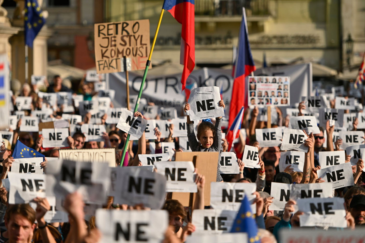 Люди пришли с флагами Чехии, Евросоюза и Украины. Они также принесли транспаранты с надписями: «Лицом к Западу, спиной к Путину», «Не хотим здесь Россию», «Нет коммунизму и фашизму», «Стоп Бабишу» и другими.