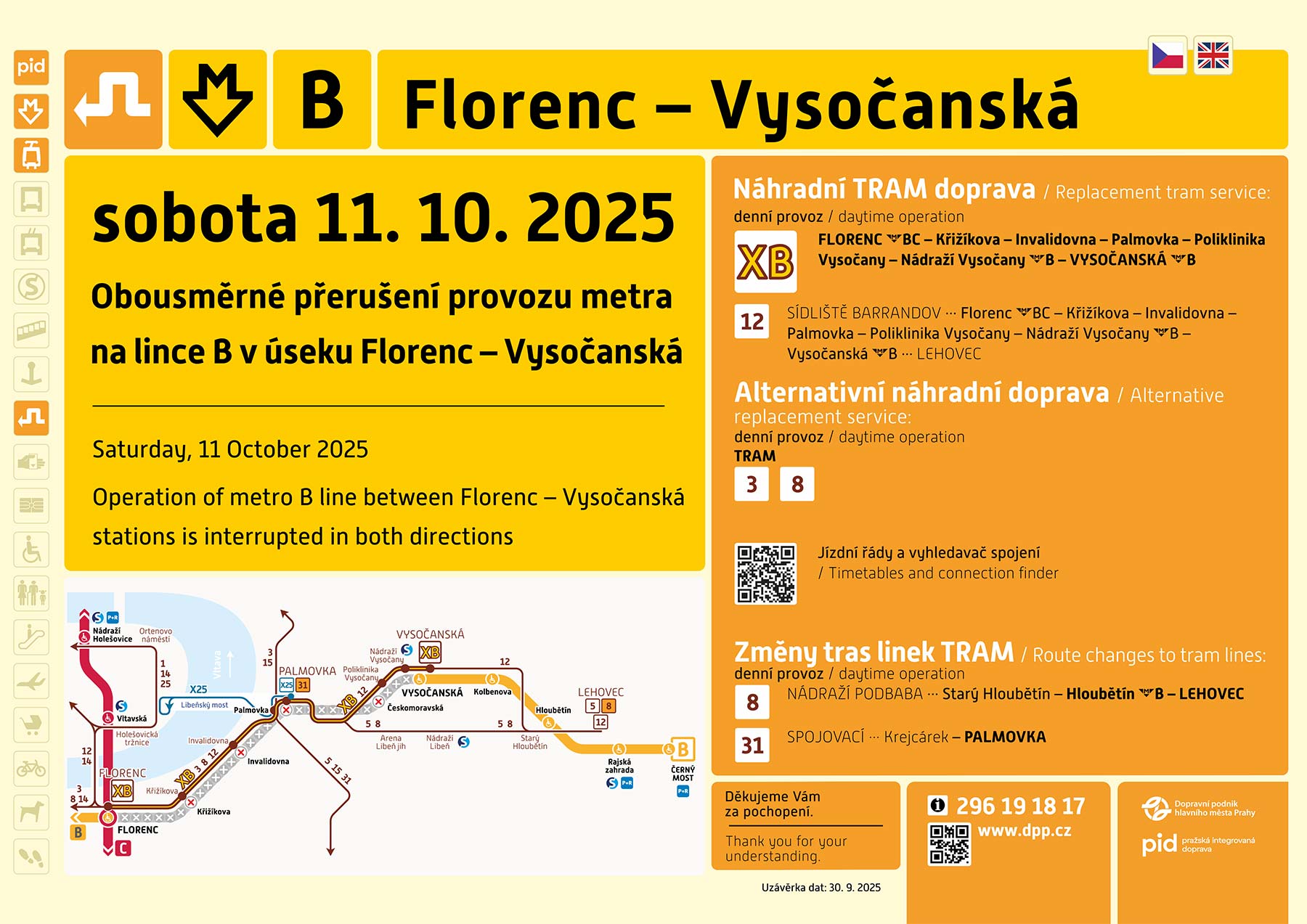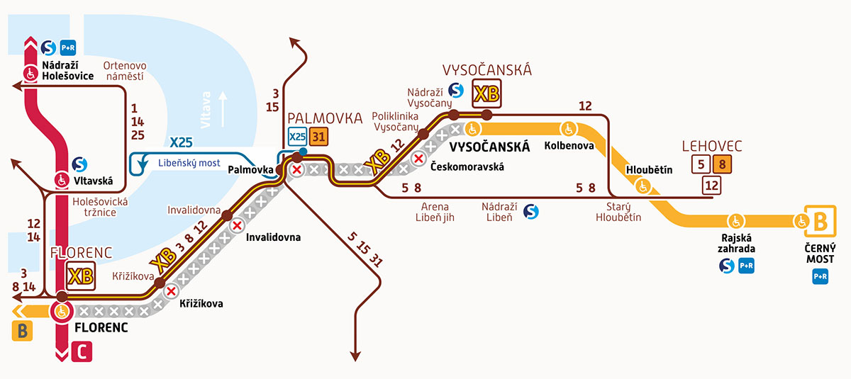 🚃 Для пассажиров будет организован компенсационный трамвайный маршрут «XB» со следующими остановками: FLORENC – Křižíkova – Invalidovna – Palmovka – Poliklinika Vysočany – Nádraží Vysočany – VYSOČANSKÁ.