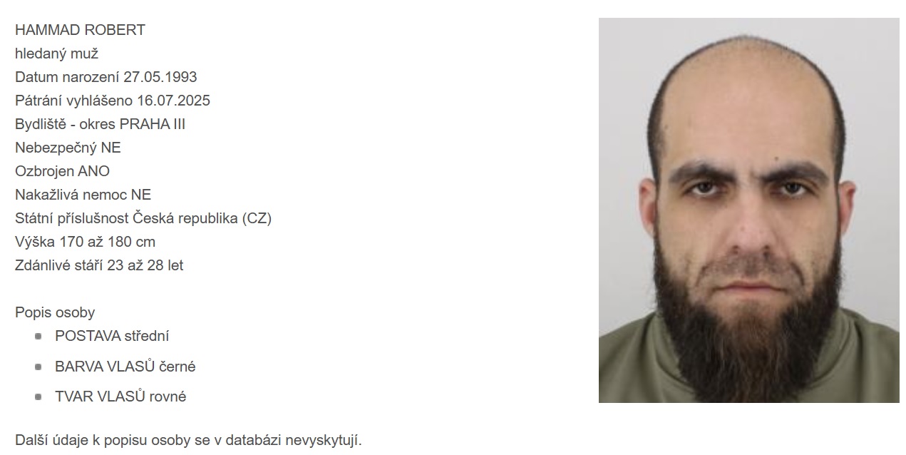 Пражские криминалисты разыскивают опасного рецидивиста Роберта Хаммада, который может быть вооружен огнестрельным оружием. Следователи полагают, что он значительно изменил внешность, в том числе сбрил бороду.