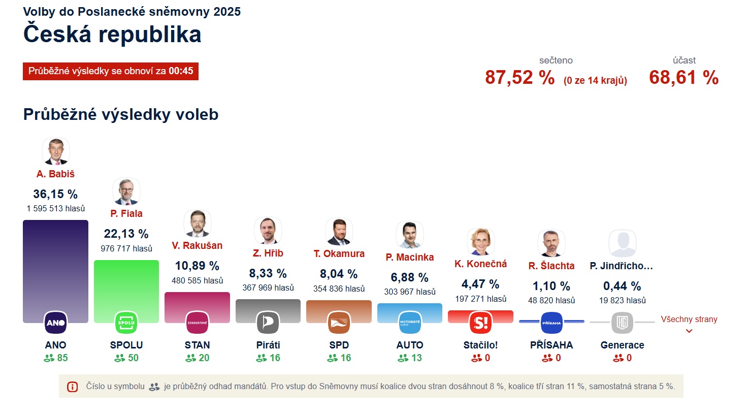 Партия ANO досрочно выиграла парламентские выборы в Чехии