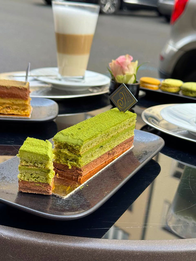 Киото – крем и чай матча, миндальный бисквит из чая матча, шоколадный ганаш и бисквит (без глютена);