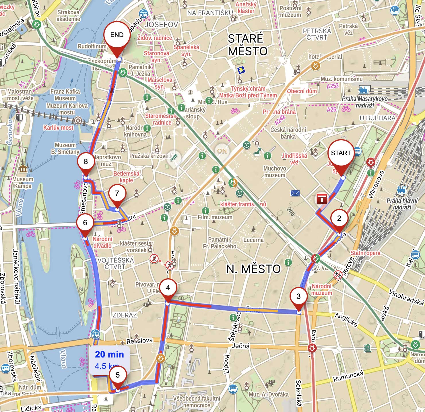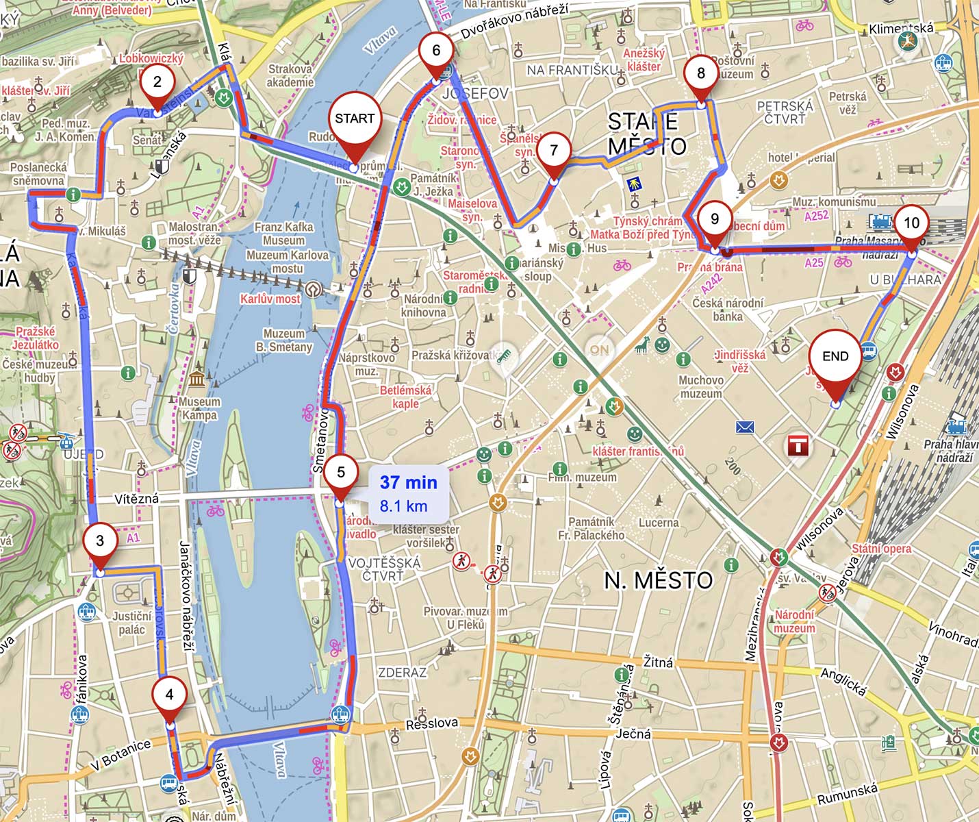 В первой части пути автомобили проедут мимо Государственной оперы и Национального музея, спустятся через Карлову площадь вниз к Влтаве, проедут мимо Танцующего дома до Национального театра, вернутся обратно на Сметанову набережную и доберутся до Рудольфинума, перед которым будет примерно 45-минутная остановка для общения со СМИ.