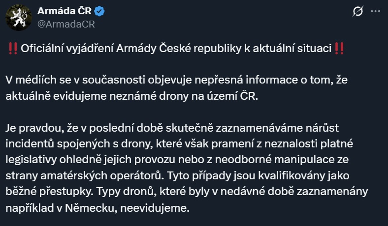 «В медиа распространяется неточная информация о том, что мы в настоящее время фиксируем неизвестные дроны на территории Чехии.
