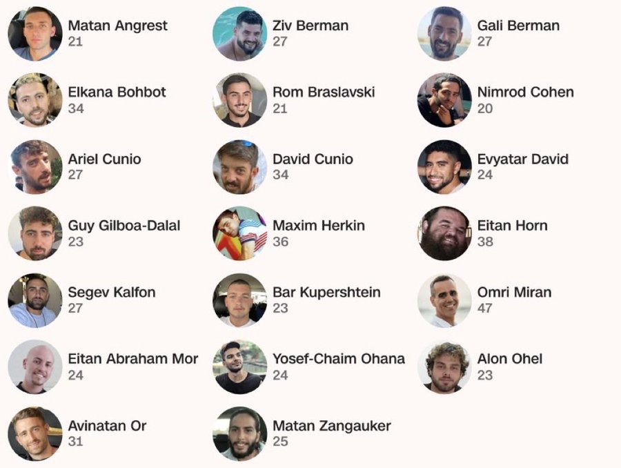 В первой группе освобожденных были Алон Охель, Матан Ангрест, Эйтан Мор, Гали и Зив Берман, Омри Миран и Гай Гильбоа-Даллал, во второй – Элькана Бухбут, Бар Куперштейн, Максим Харкин, Сегев Кальфон, Эйтан Горн, Давид Кунио, Ариэль Кунио, Нимрод Коэн, Авинатан Ор, Йосеф Хаим Охана, Матан Ценгаукер, Эвьятар Давид, Ром Браславски.