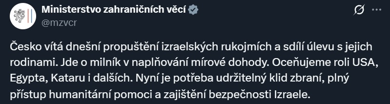 «Чехия приветствует сегодняшнее освобождение израильских заложников и разделяет облегчение с их семьями. Это важный пункт в выполнении мирного соглашения. Мы высоко оцениваем роль США, Египта, Катара и других стран. Теперь необходим устойчивый режим прекращения огня, полный доступ гуманитарной помощи и обеспечение безопасности Израиля», – говорится в заявлении Министерства иностранных дел Чехии.