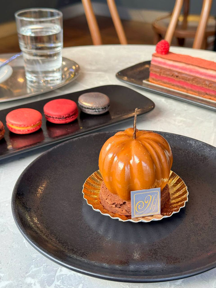 - с шоколадным муссом из молочного и горького шоколада, пряничными специями, кремом из тыквы, шоколадным бисквитом;
