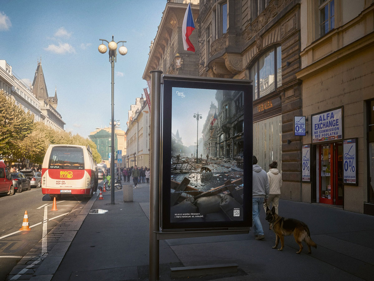 На нескольких оживленных местах в центре Праги появились баннеры с изображением того, как могла бы выглядеть конкретная улица, на которой находится зритель, в случае войны.