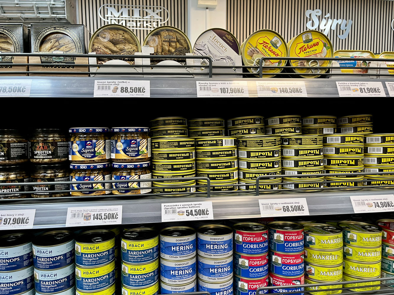 В магазине есть несколько видов красной и черной икры, любимые шпроты, килька в томатном соусе, печень трески, горбуша и другие рыбные консервы.