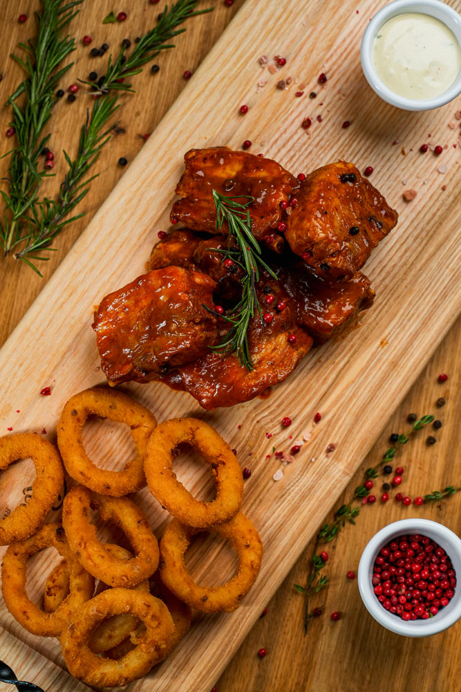 В числе гарниров – несколько видов картофеля, овощи-гриль и луковые кольца в кляре.
