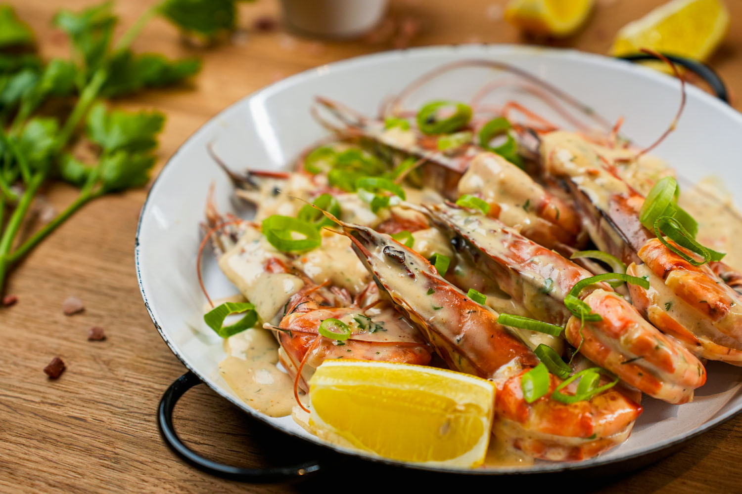 Есть и приготовленные на гриле креветки и рыба (дорада).