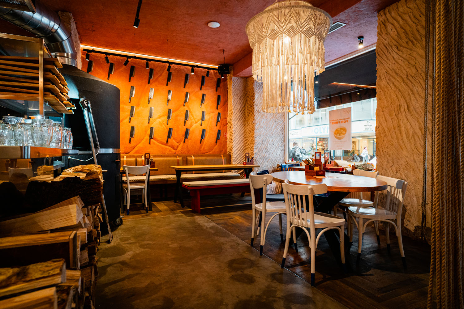 Ключевой элемент зала — открытая кухня с вращающимся грилем.
