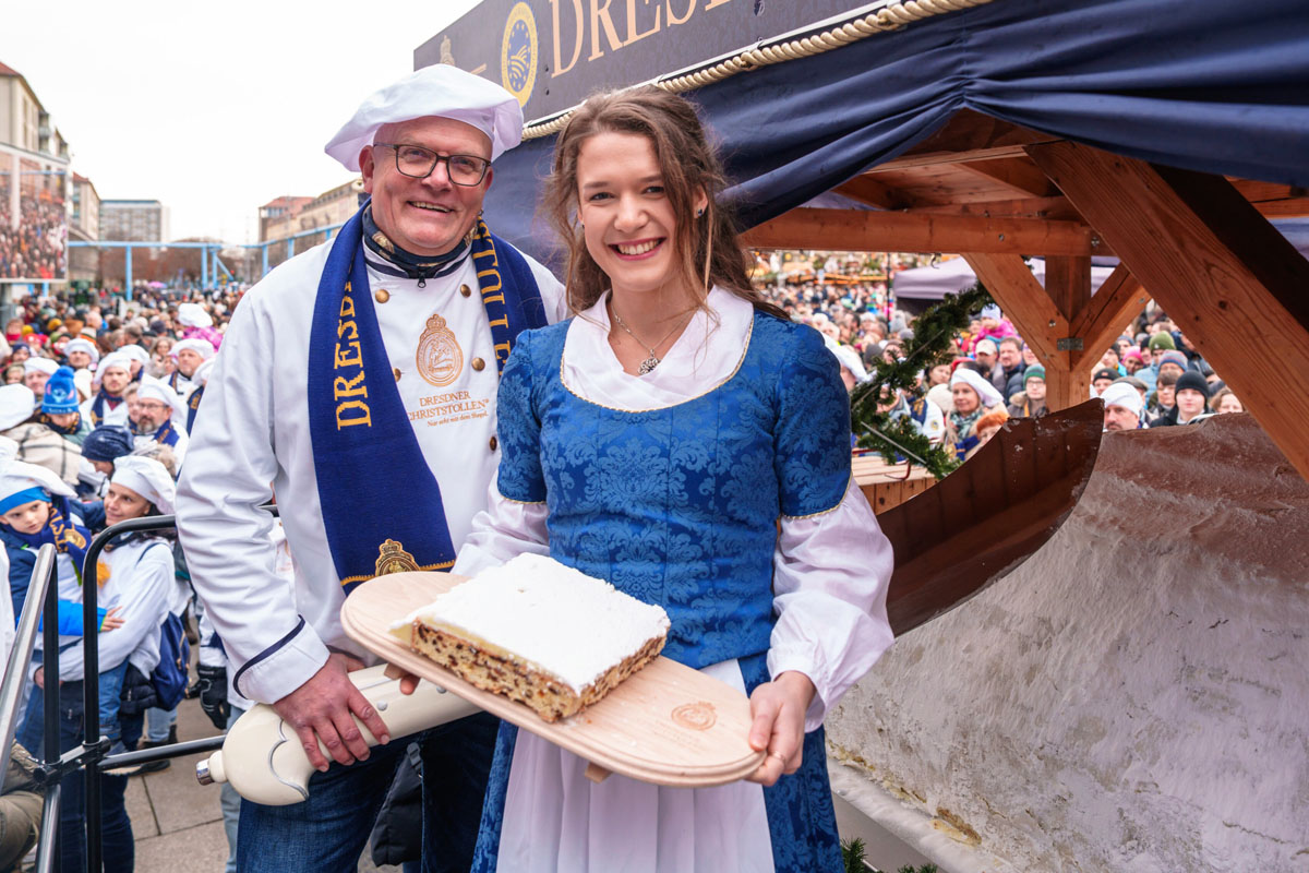 По улицам города будут проходить костюмированные процессии, гигантский штоллен повезут на специальной тележке, будет много музыки, танцев, акробатических выступлений и прочих проявлений радости, которые закончатся торжественным разрезанием штоллена.